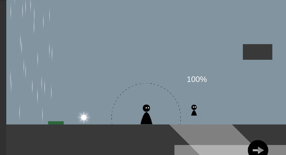 Here’s how the game looked in 2019 when I first tested its concept. From left to right: rain, a green trampoline, a star collectible, the player (tall figure) with a protective shield (dotted line), and the child (small figure) with full health (phew!).